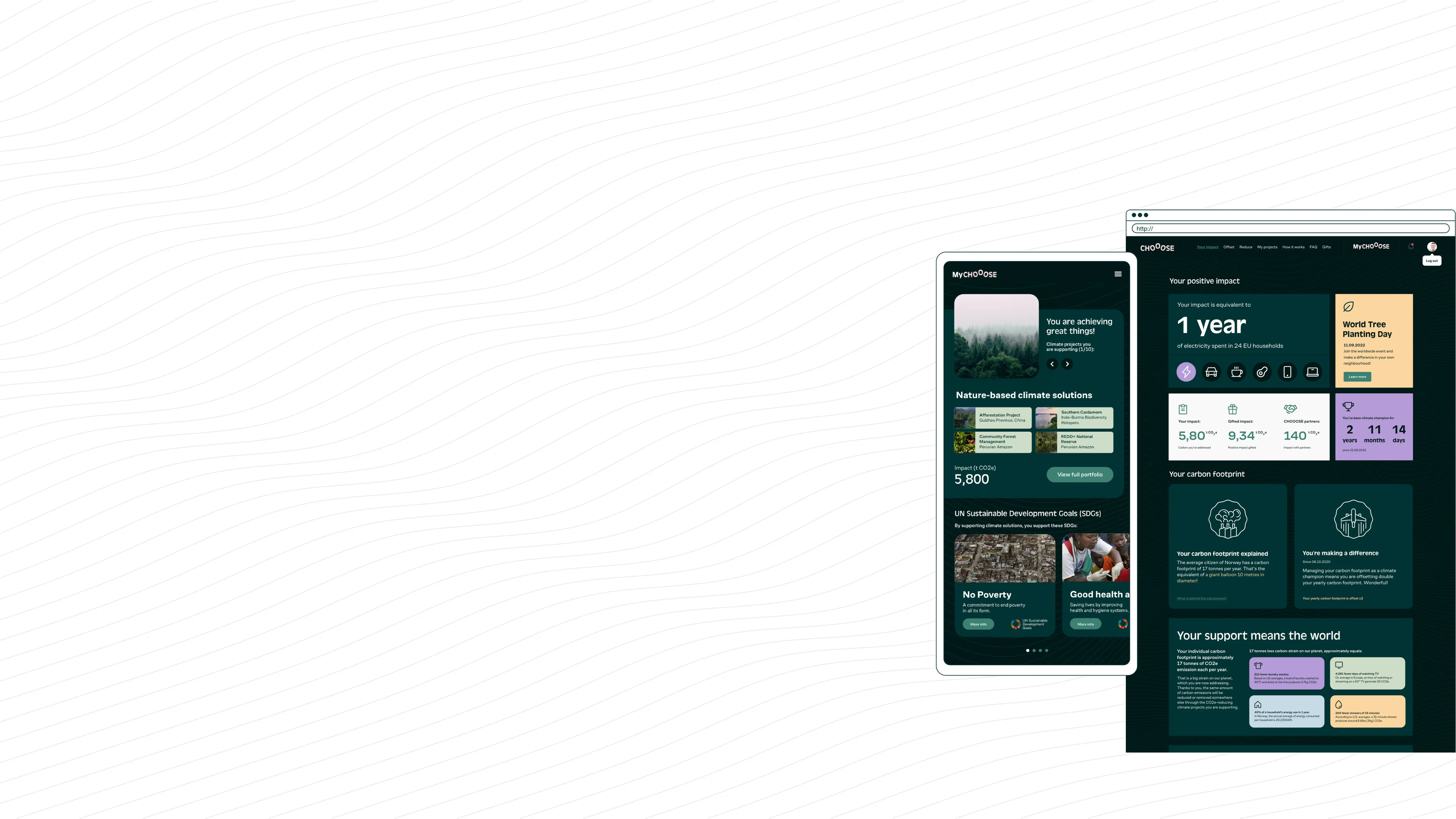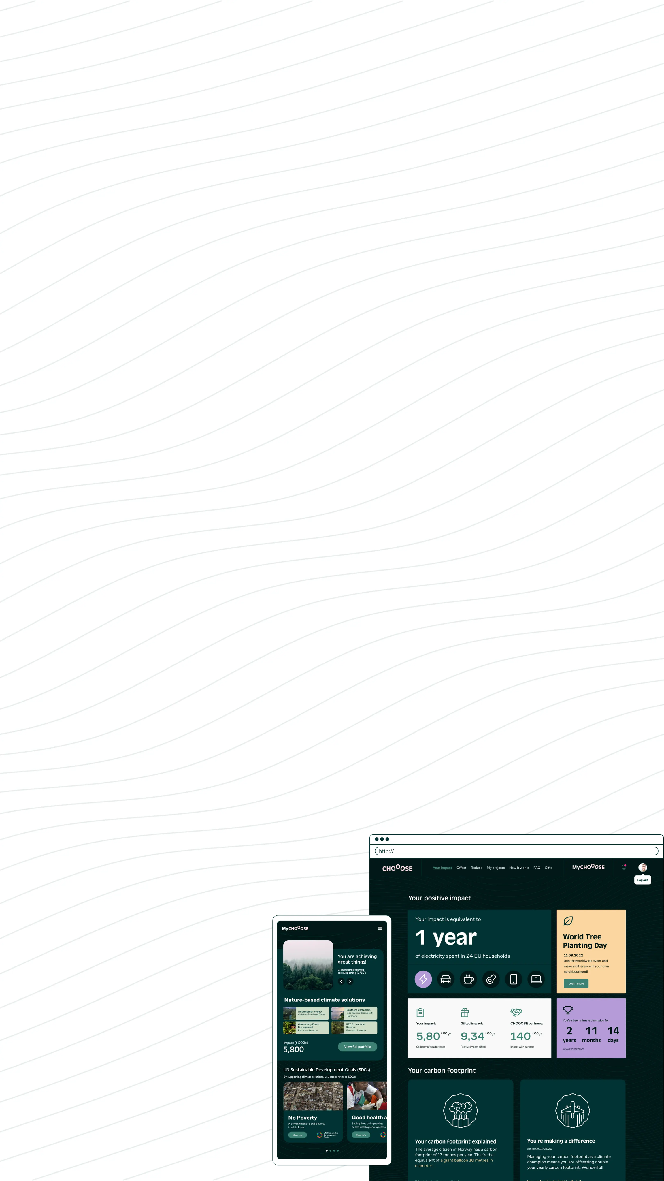 With MyCHOOOSE you can easily measure, reduce, and manage your carbon footprint, understand and engage with your positive impact, and get closer to the projects you are supporting. It's free to sign up: you only pay for the positive impact you decide to create.
